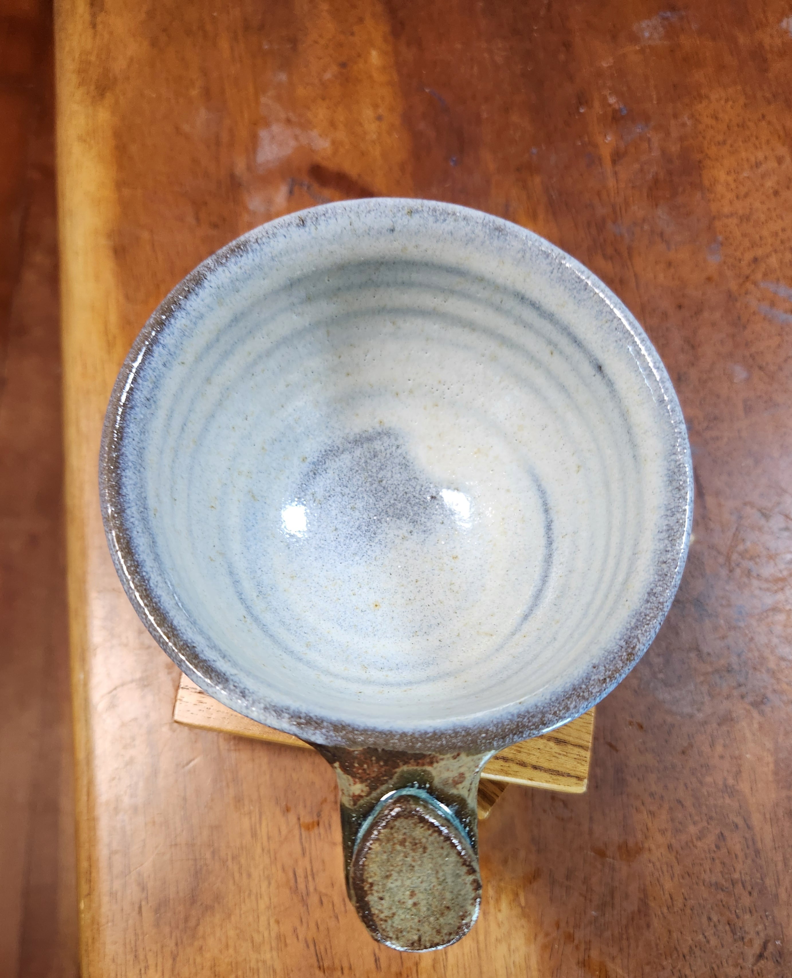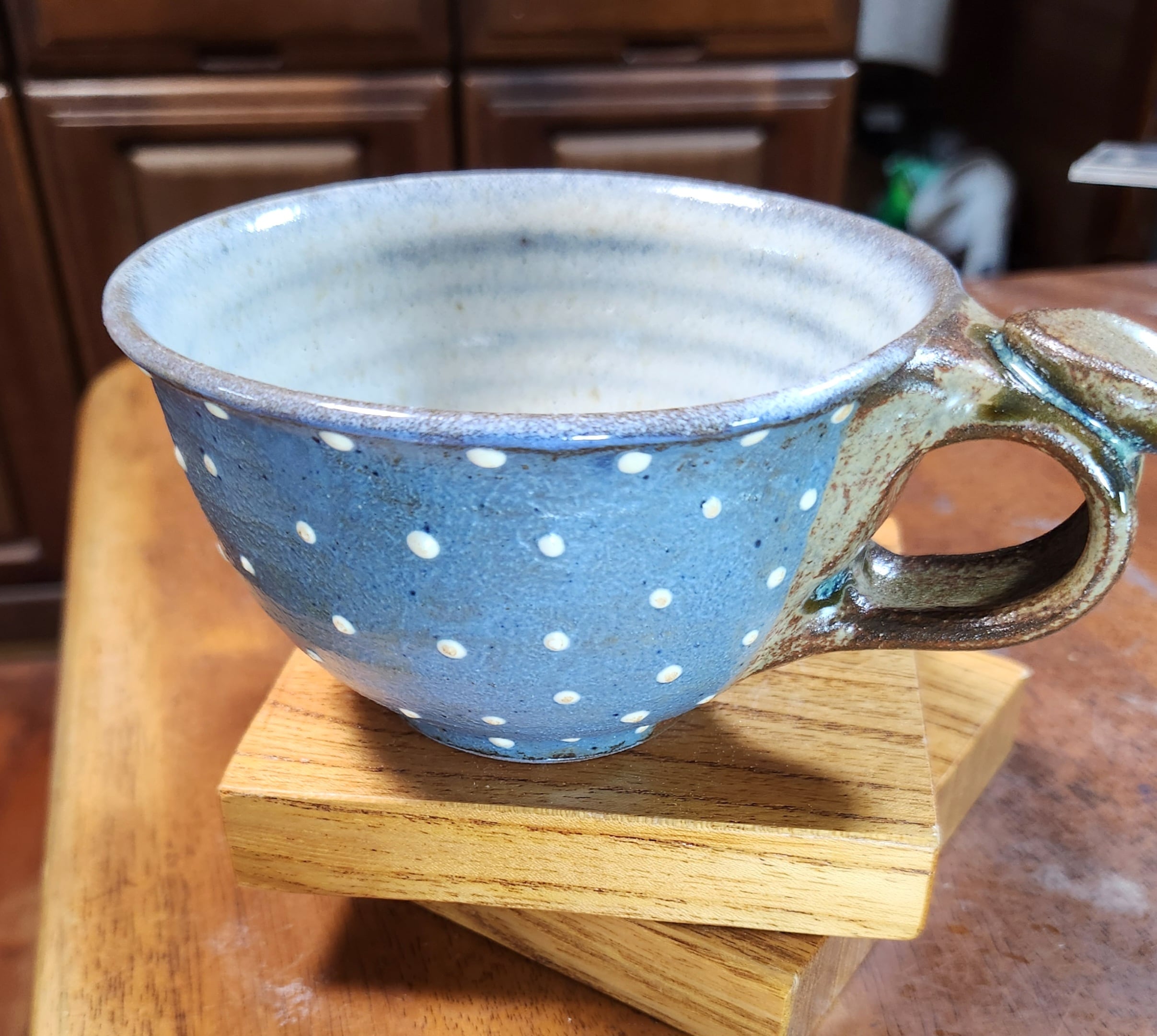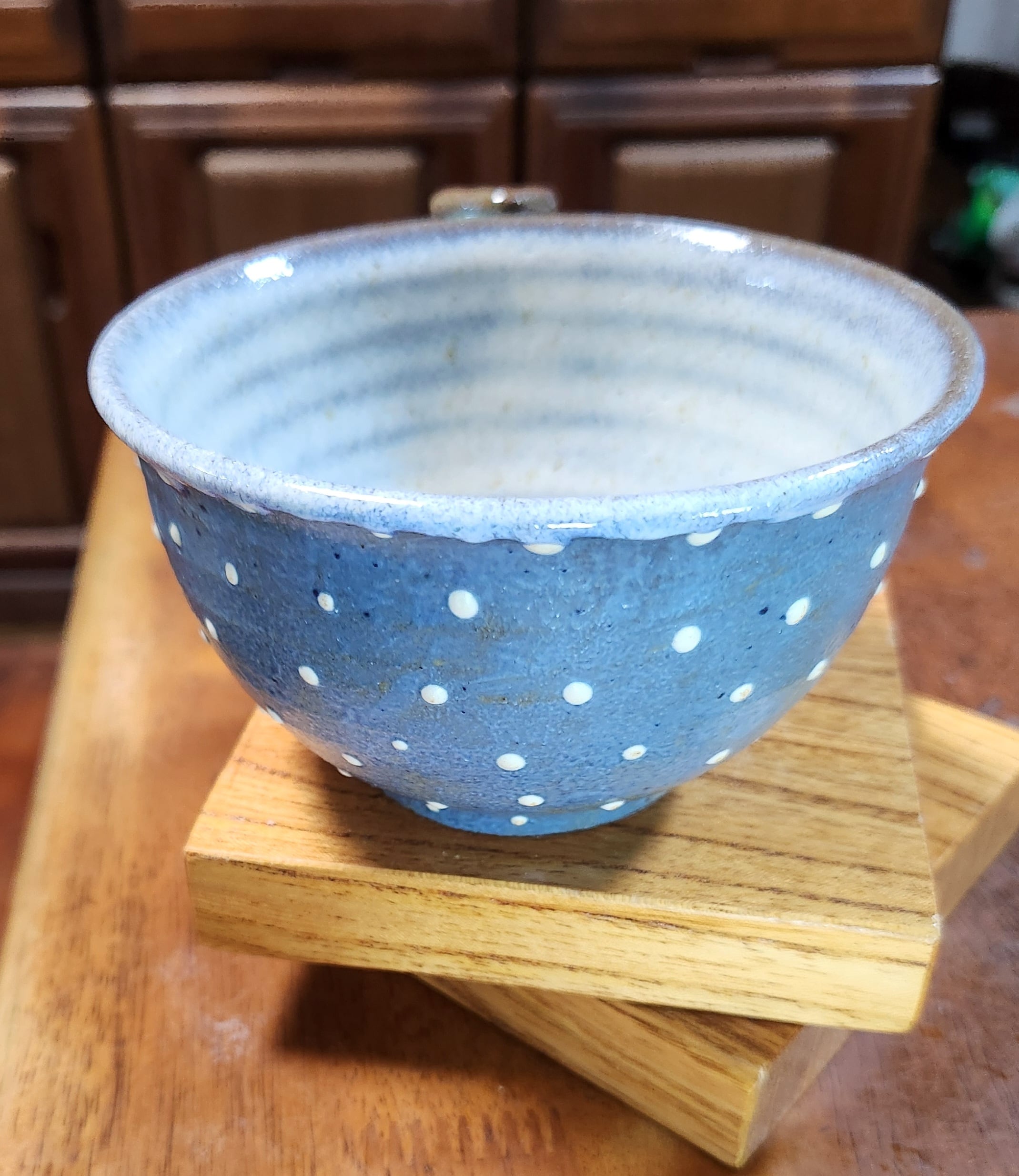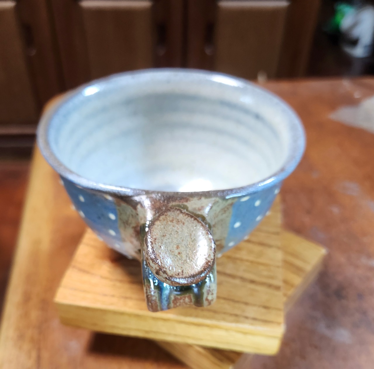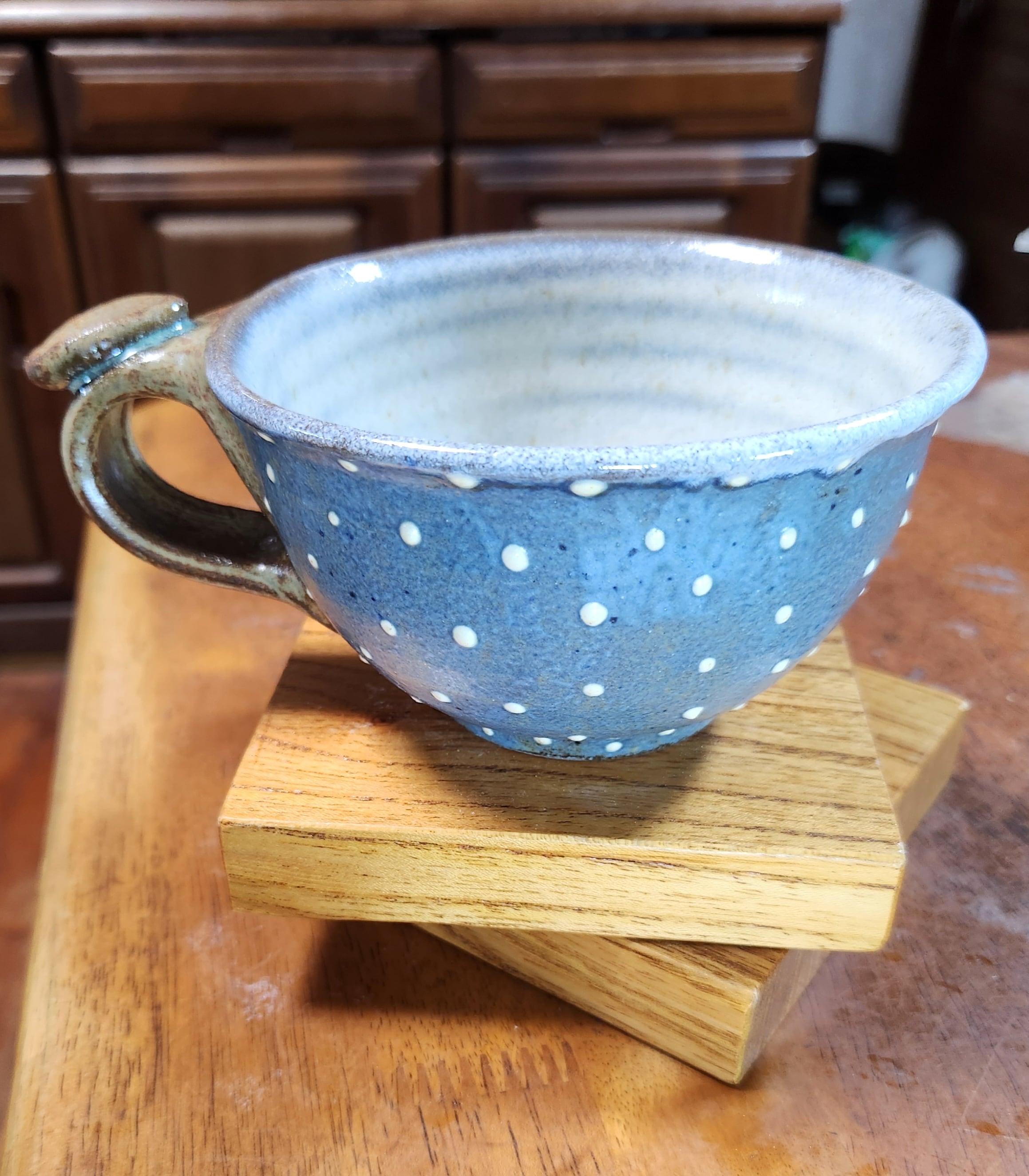 カップの直径が約12.5センチ高さが約7.5センチのスープカップです 水色に染めた素地に白土でピンドットを描きました うつわの内側はサトウキビで拵えた白釉を施してあります