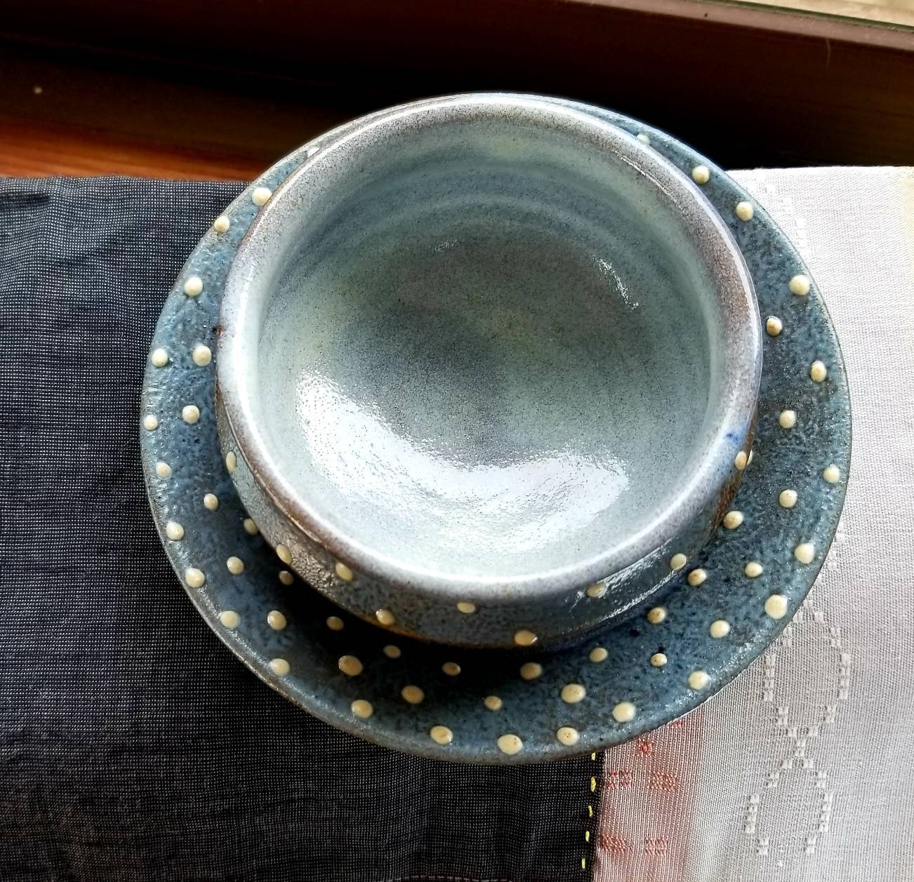カップの口径は約10センチ高さは約5センチソーサーの直径は約15センチ高さは約2.5センチです 白土を絞り出しながら描く「いっちん」の技法でピンドットを描きました