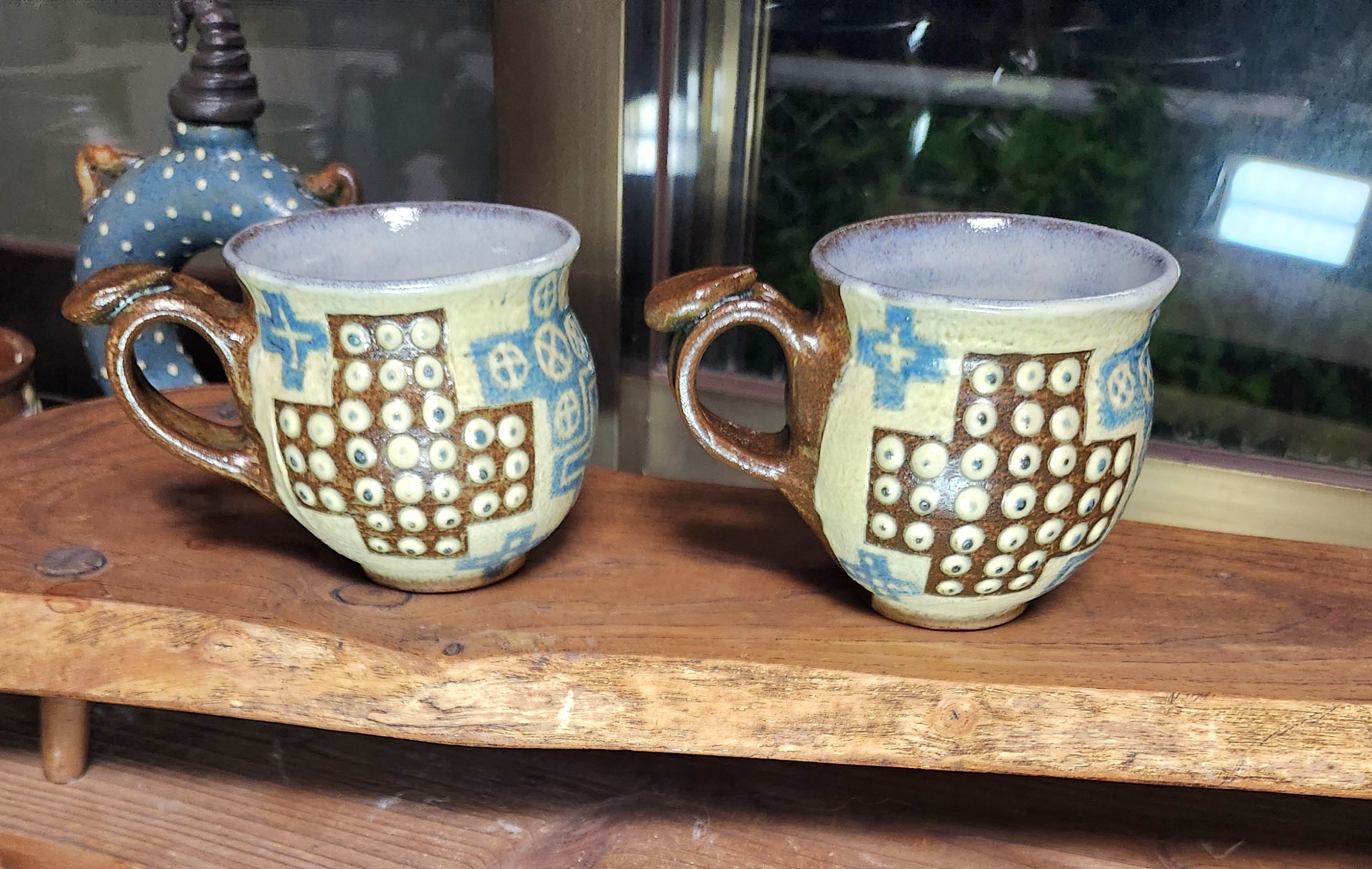 蝋抜き、いっちんなどの技法でたくさんのプラス+を描きました うつわの内側はサトウキビ灰でこしらえた白釉を施してあります