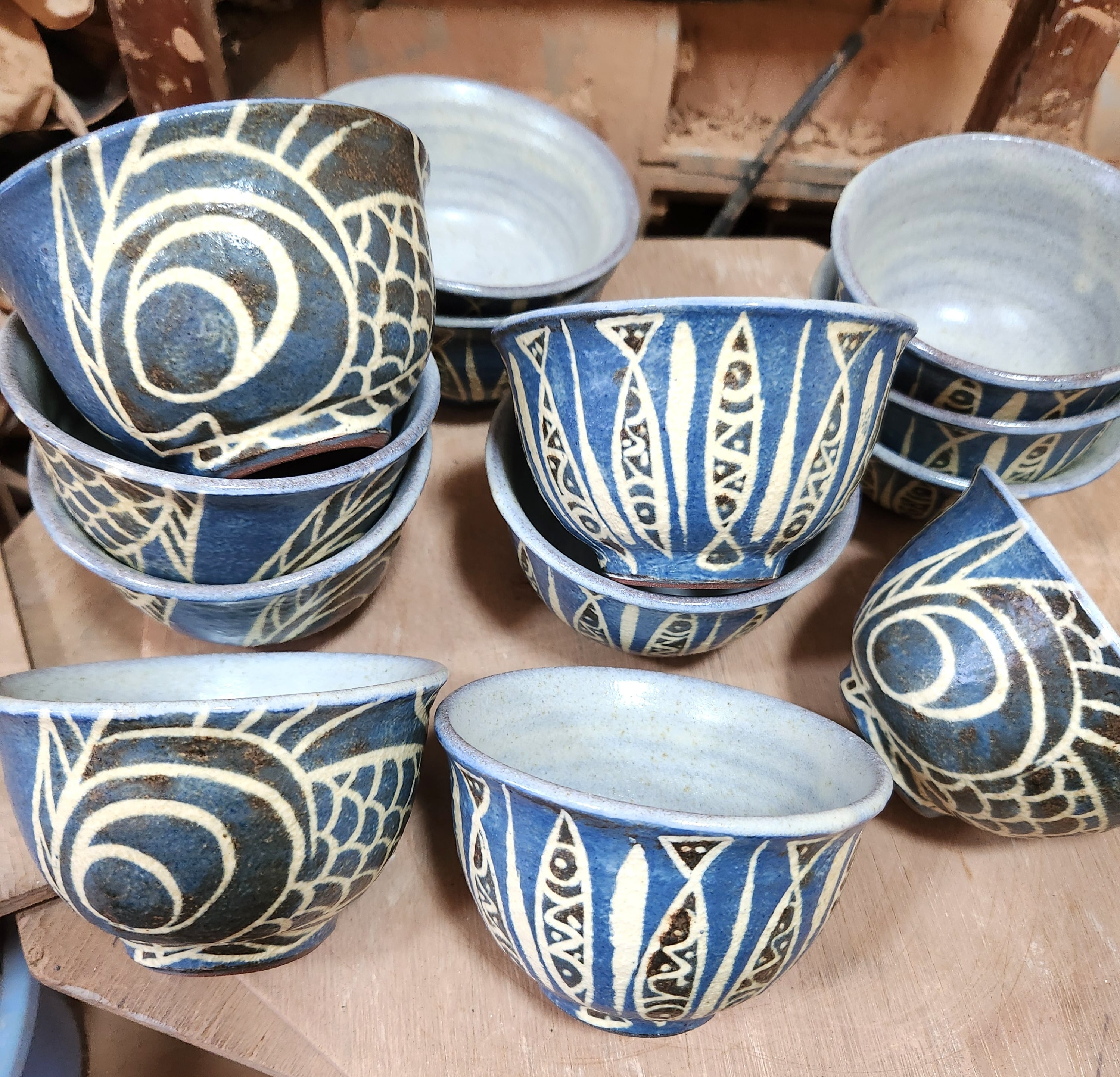 青色の素地に大きく匹の魚が描かれています。うつわの内側はサトウキビ釉でやわらかな白色です。