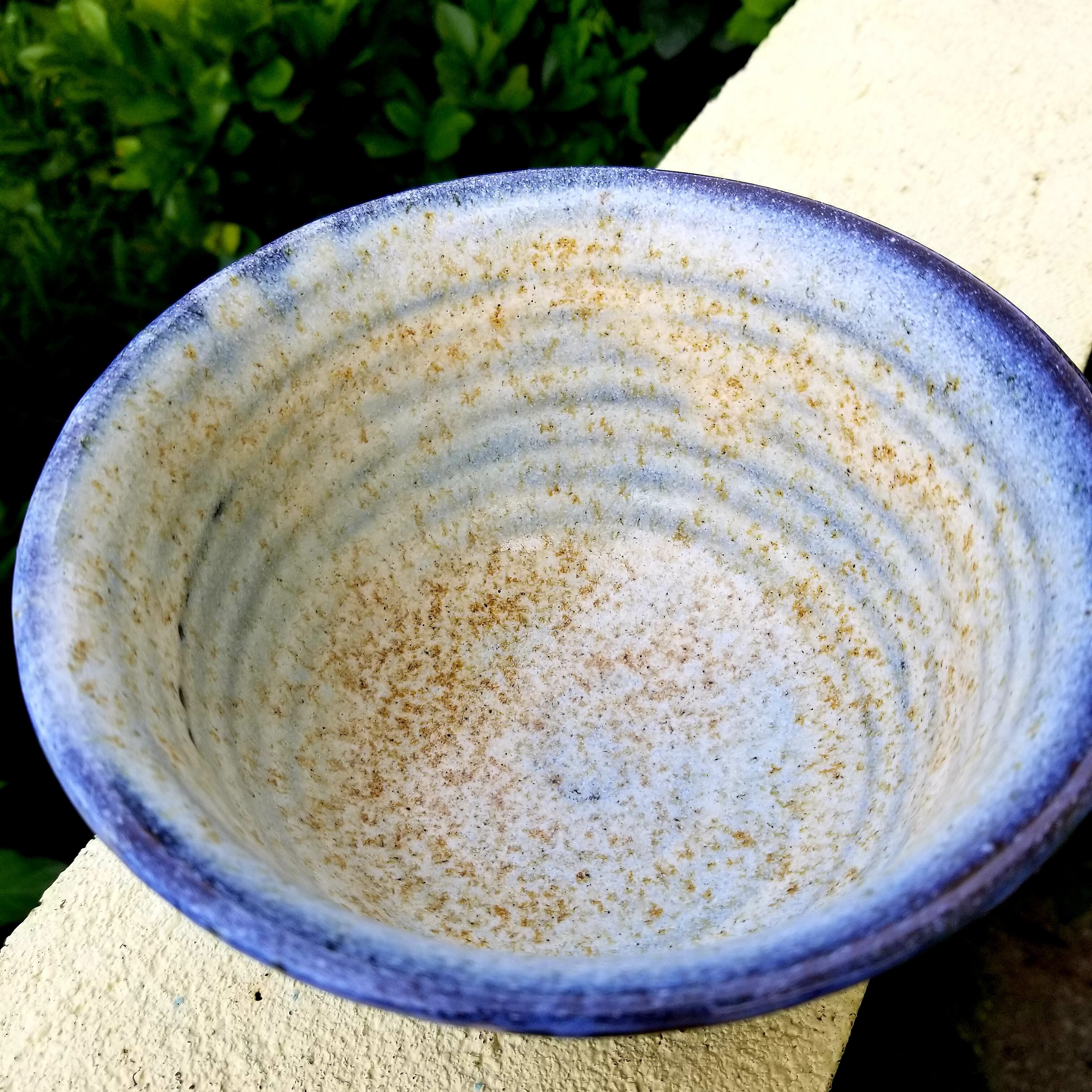 そばマカイ(丼)です 青い素地に大きなさかなを描きました。直接は約16センチ 高さは約9センチです。器の内側にはサトウキビ釉を施してあります 柔らかな白色です
