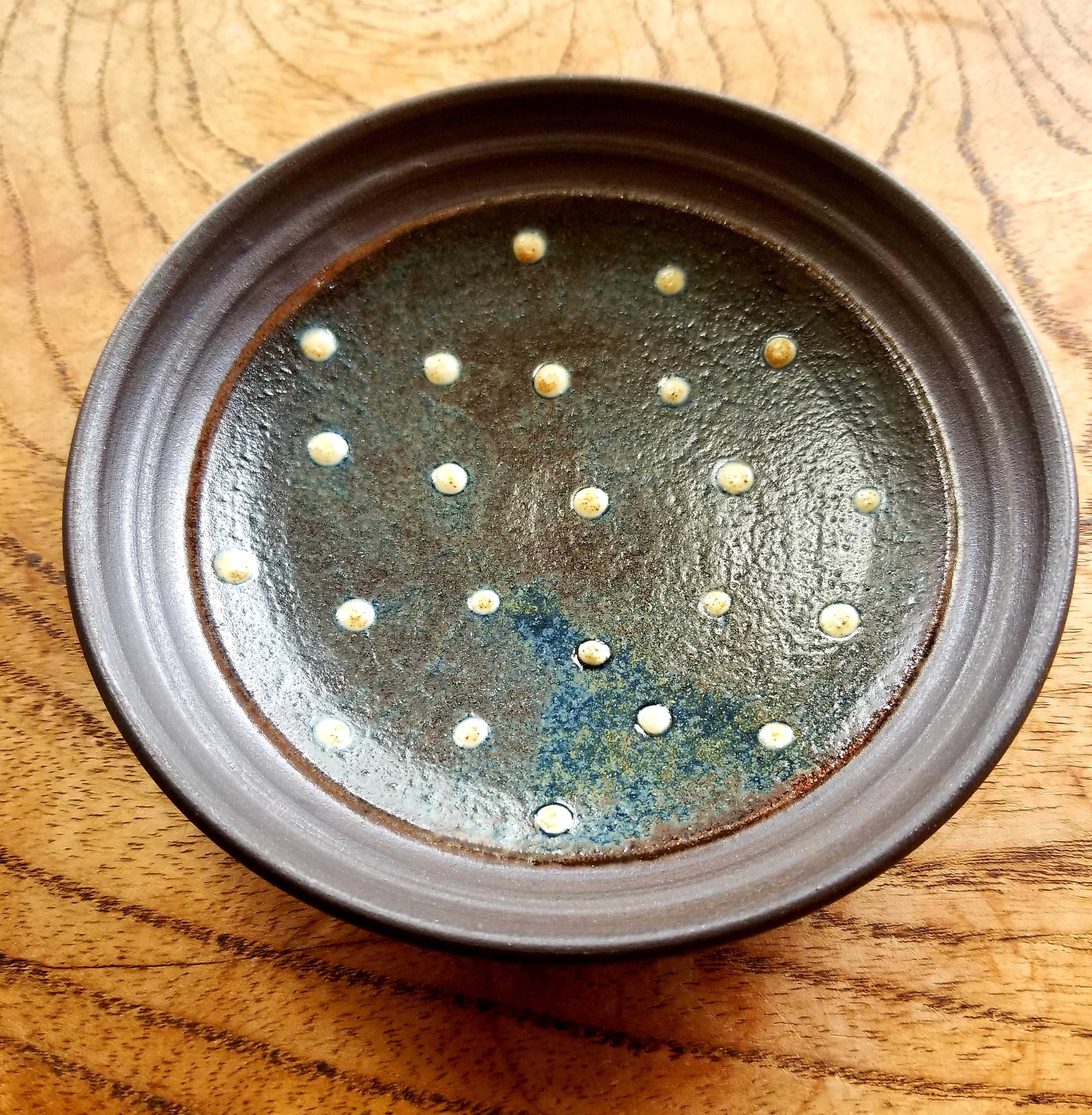 5寸直径が約15センチ高さが約3センチの銘々皿です 深い青で色付けした素地に白土のドット模様です。シックで落ち着いた色合いです