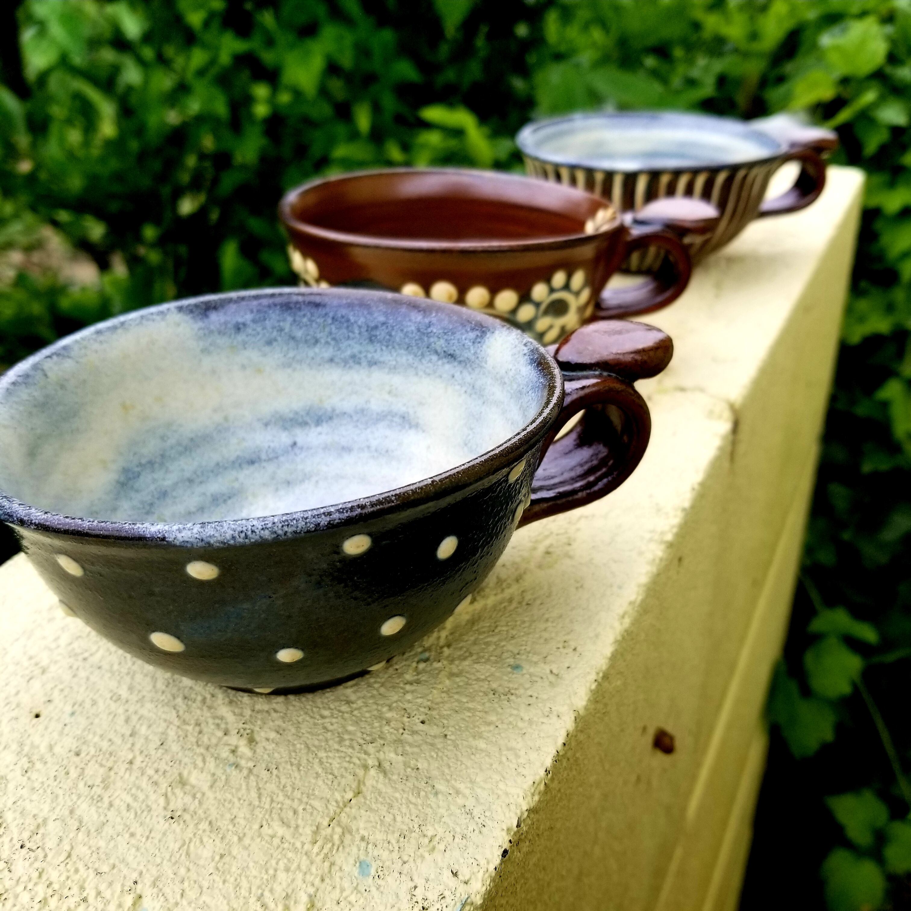 ドット模様のスープカップです 素地に濃い青色に化粧をして白土でドットを描きました