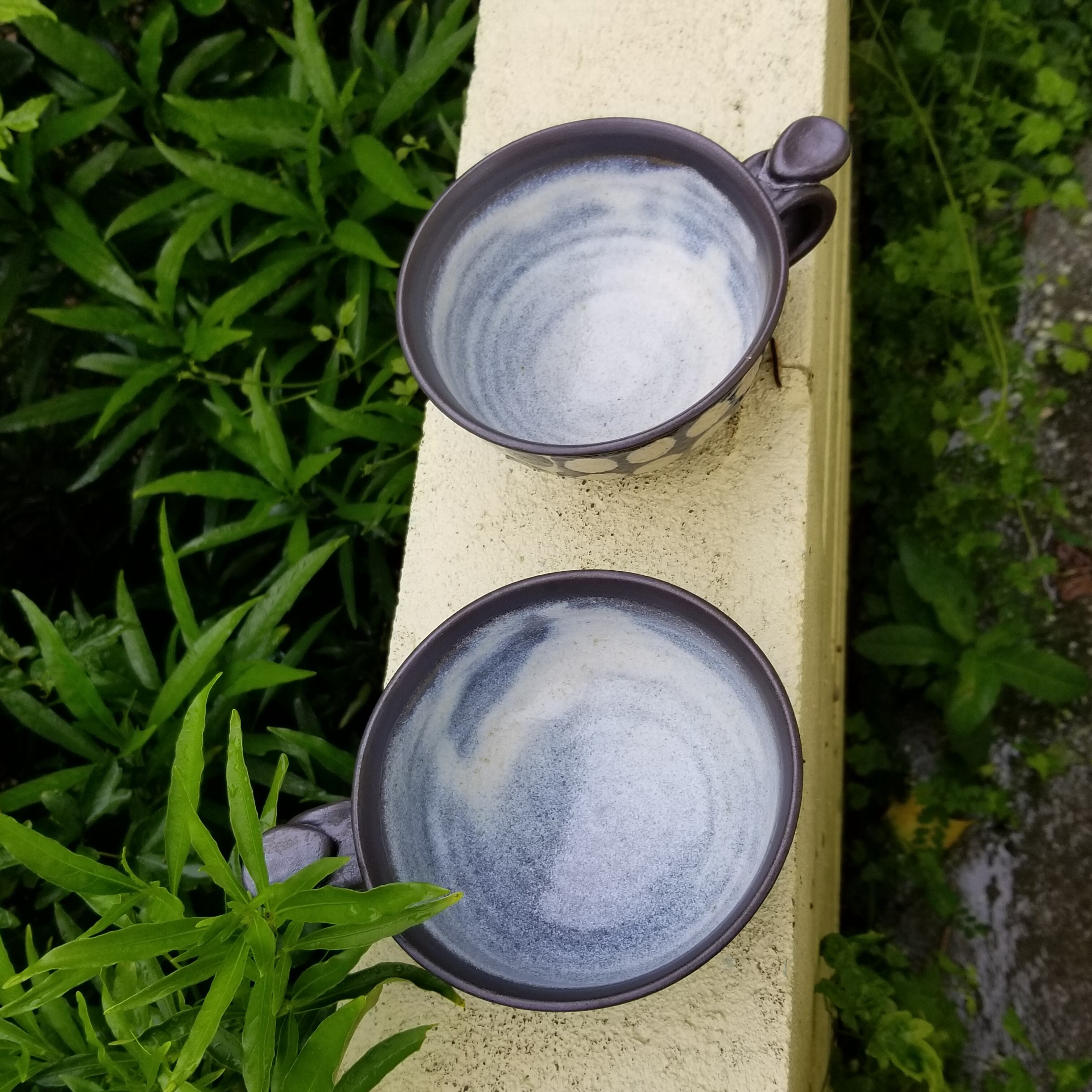 器の直径が約13センチ高さは約7センチの大振りなスープカップです 3種のドット模様が描かれています 器の内側はサトウキビ釉を施してあります 柔らかな白色です