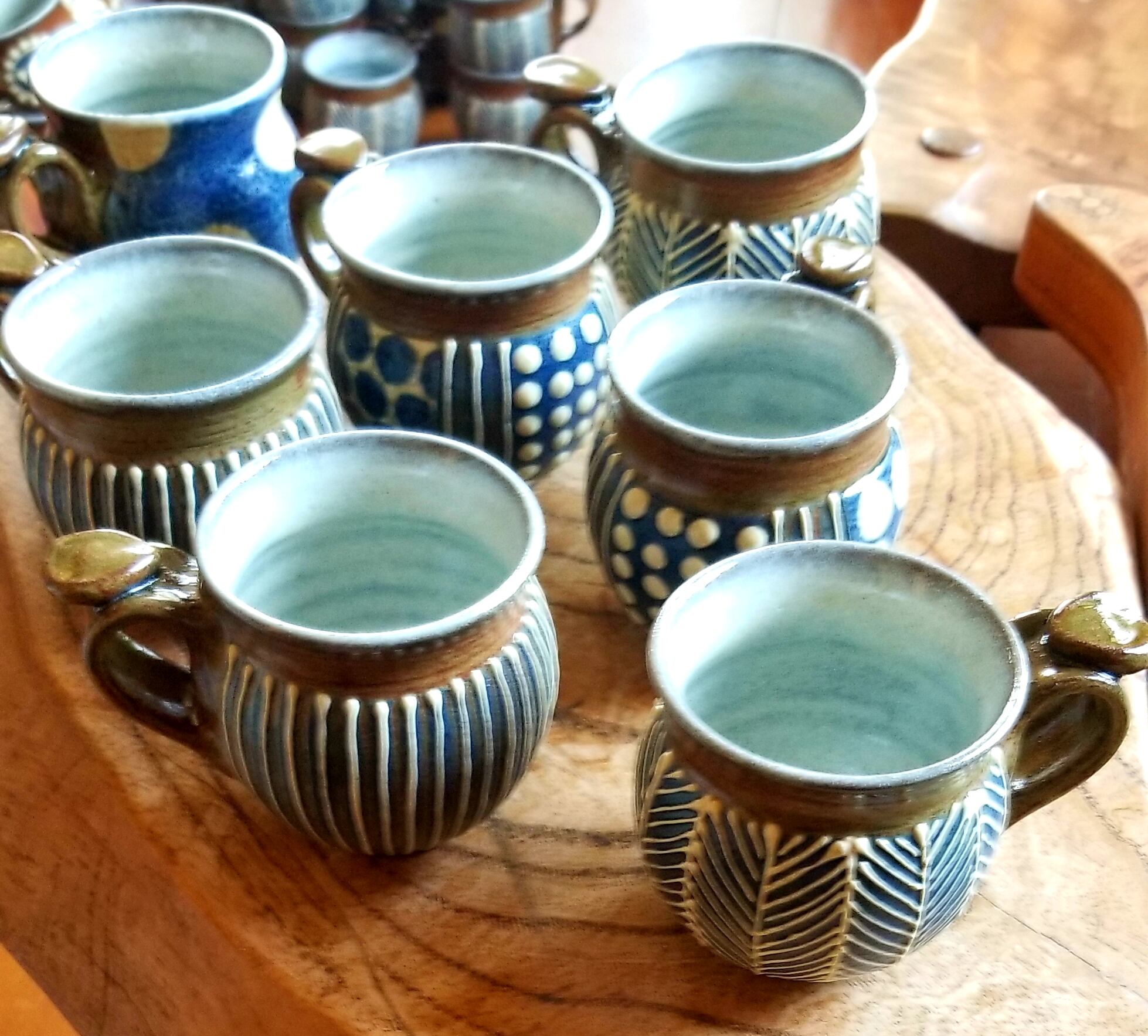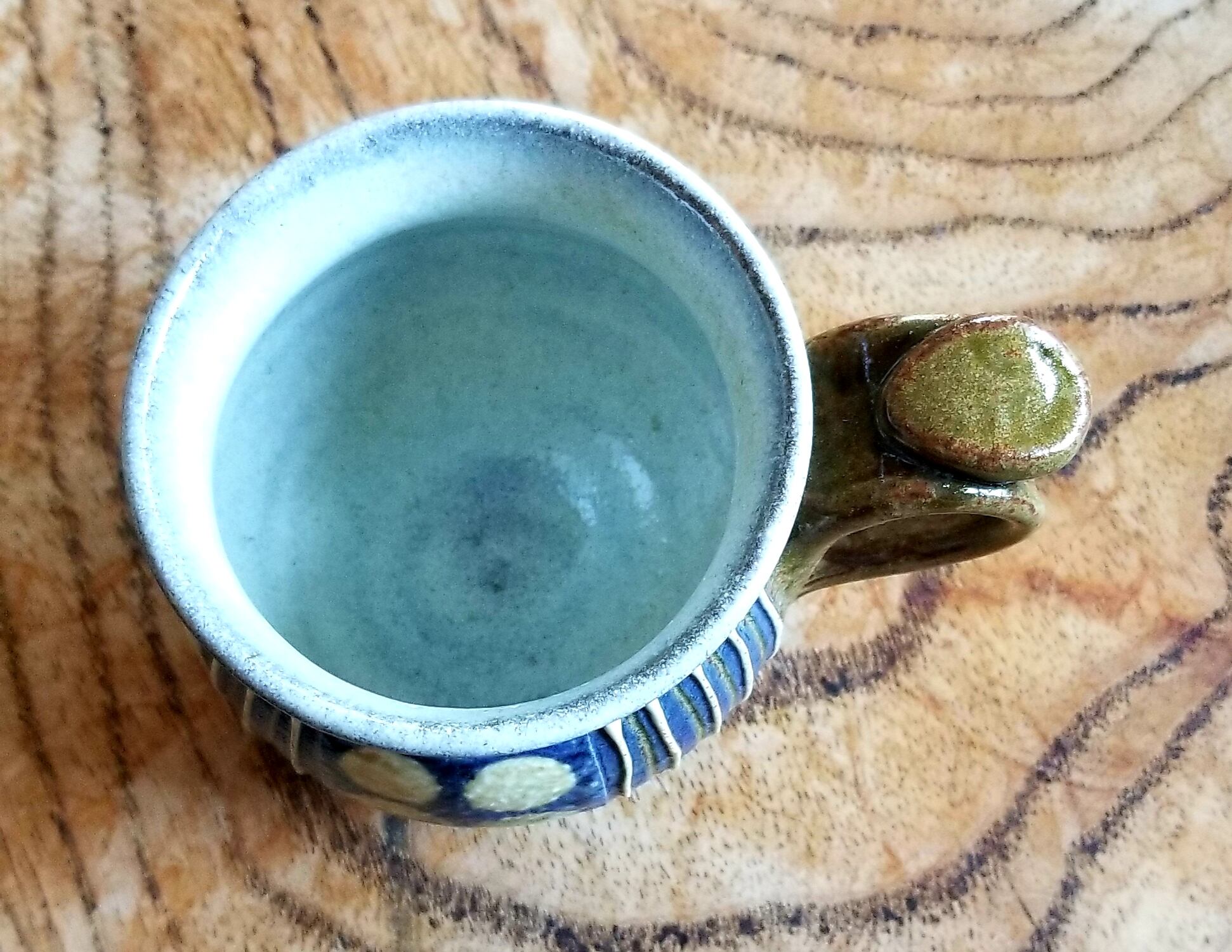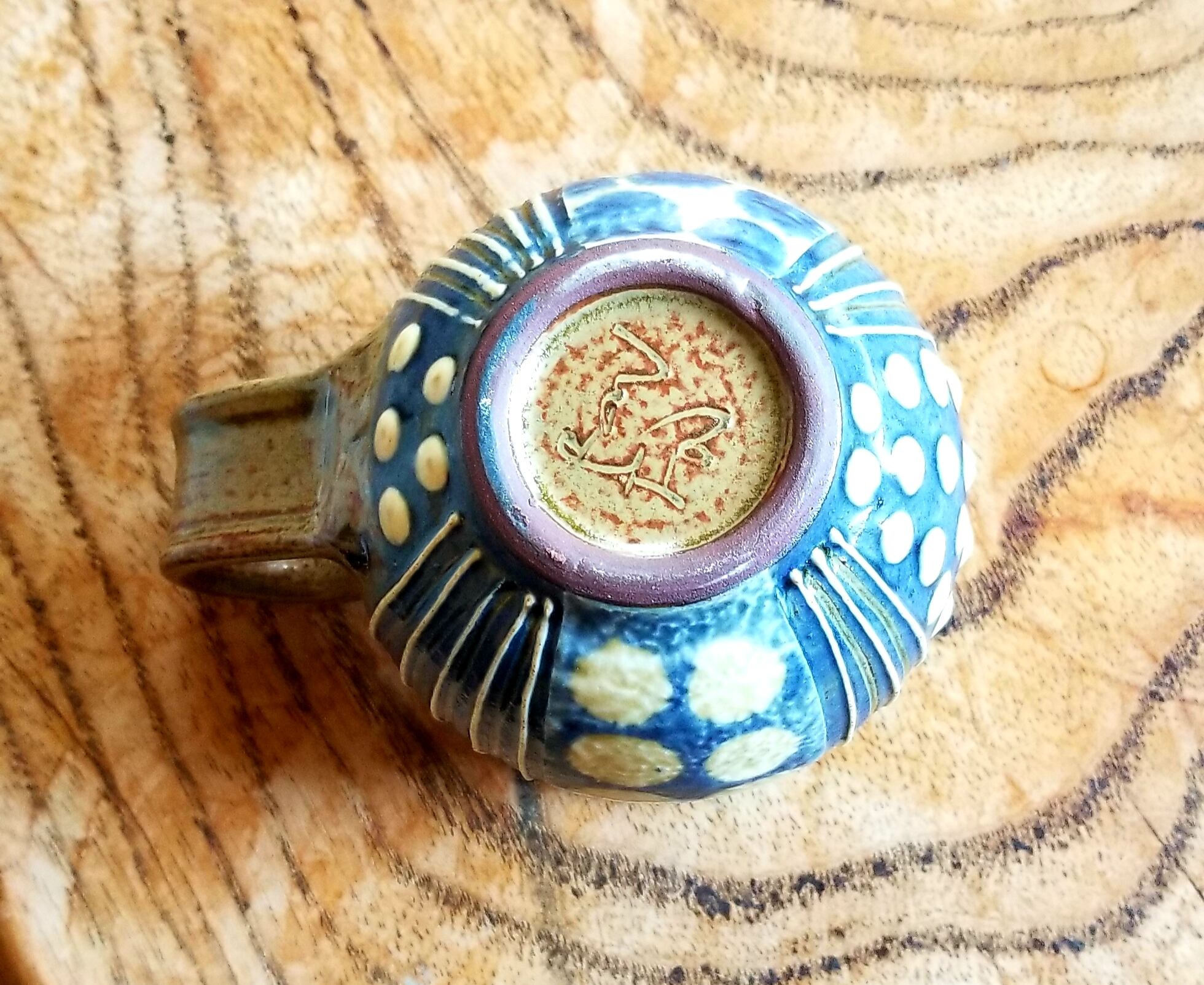 カップの外側は白土を絞り出しながら描く「いっちん」の技法でストライプやドットを描き、蝋抜きの技法でドットを描いています カップの内側はサトウキビの灰で拵えました釉薬が施してあります とても柔らかな白色です