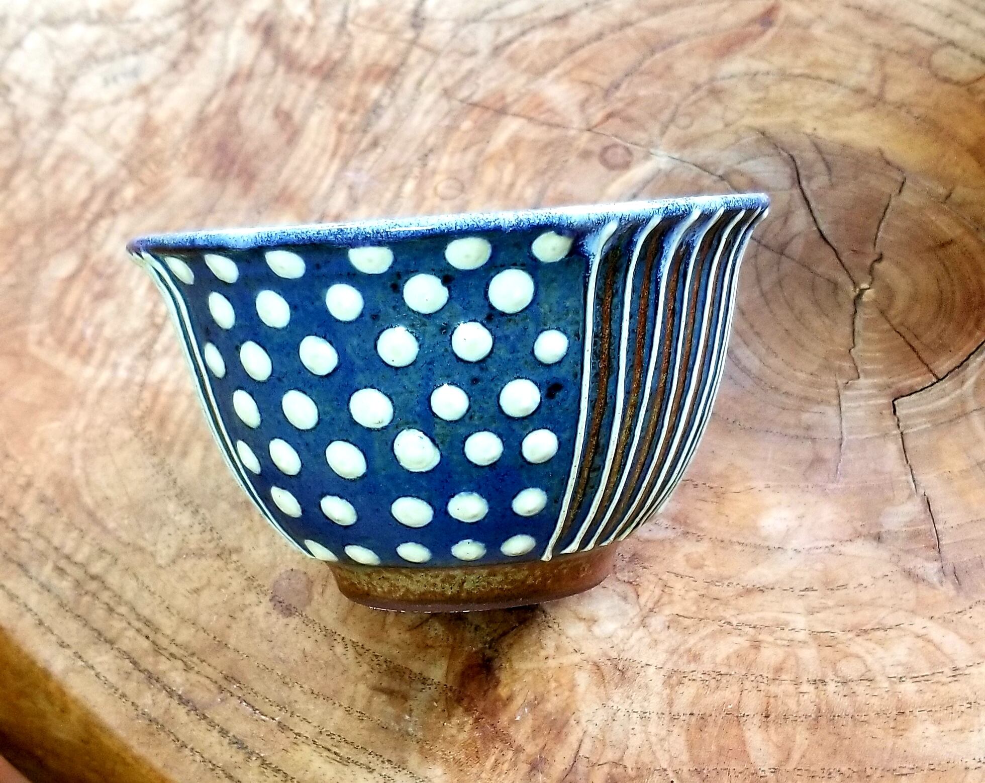 うつわの外側全体に白土(白化粧)を絞り出して描く「いっちん」の技法でドットとストライプを描きました うつわの内側にはサトウキビで拵えました白釉を施してあります やさしい白色です