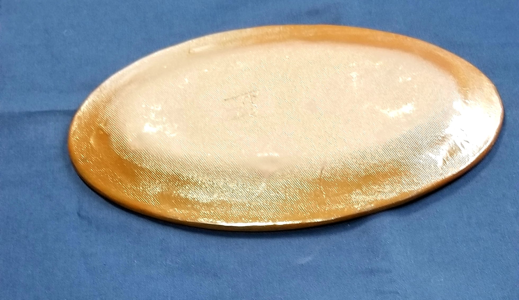 オーバル皿です 縁には白土の化粧土を絞り出して描くいっちんの技法でタコ唐草を描きました うつわの中央はサトウキビで拵えました白釉を施してあります サイズは横約27センチ縦約16.5センチです
