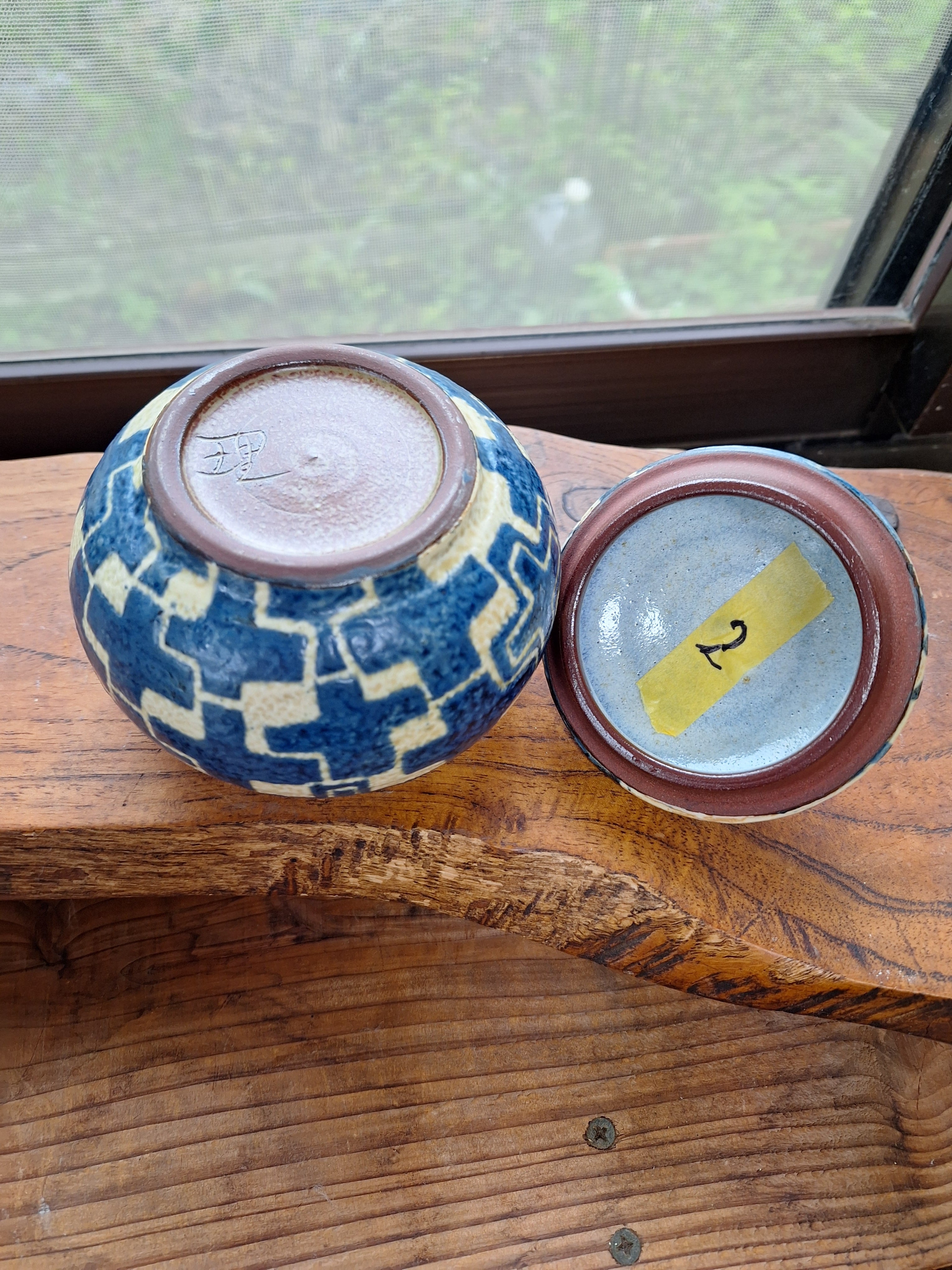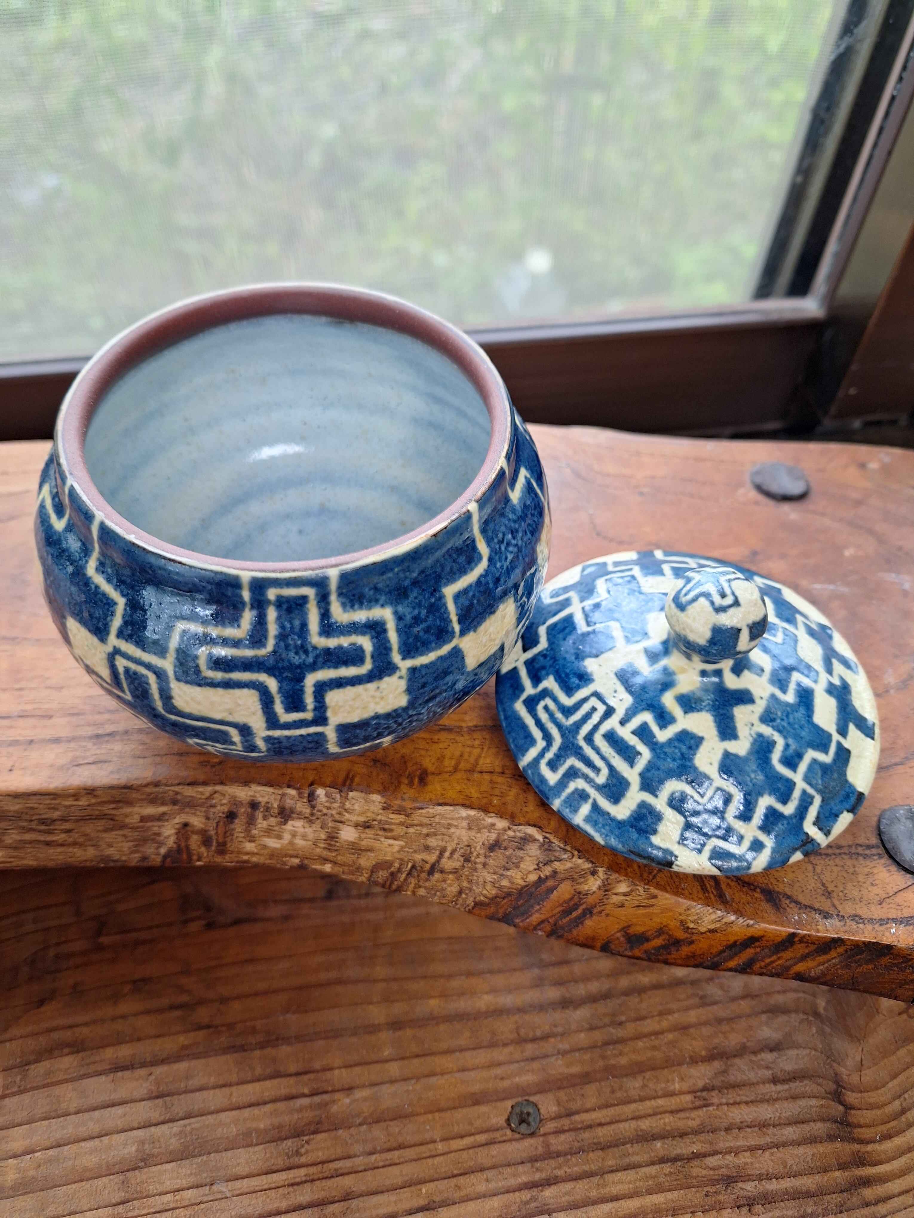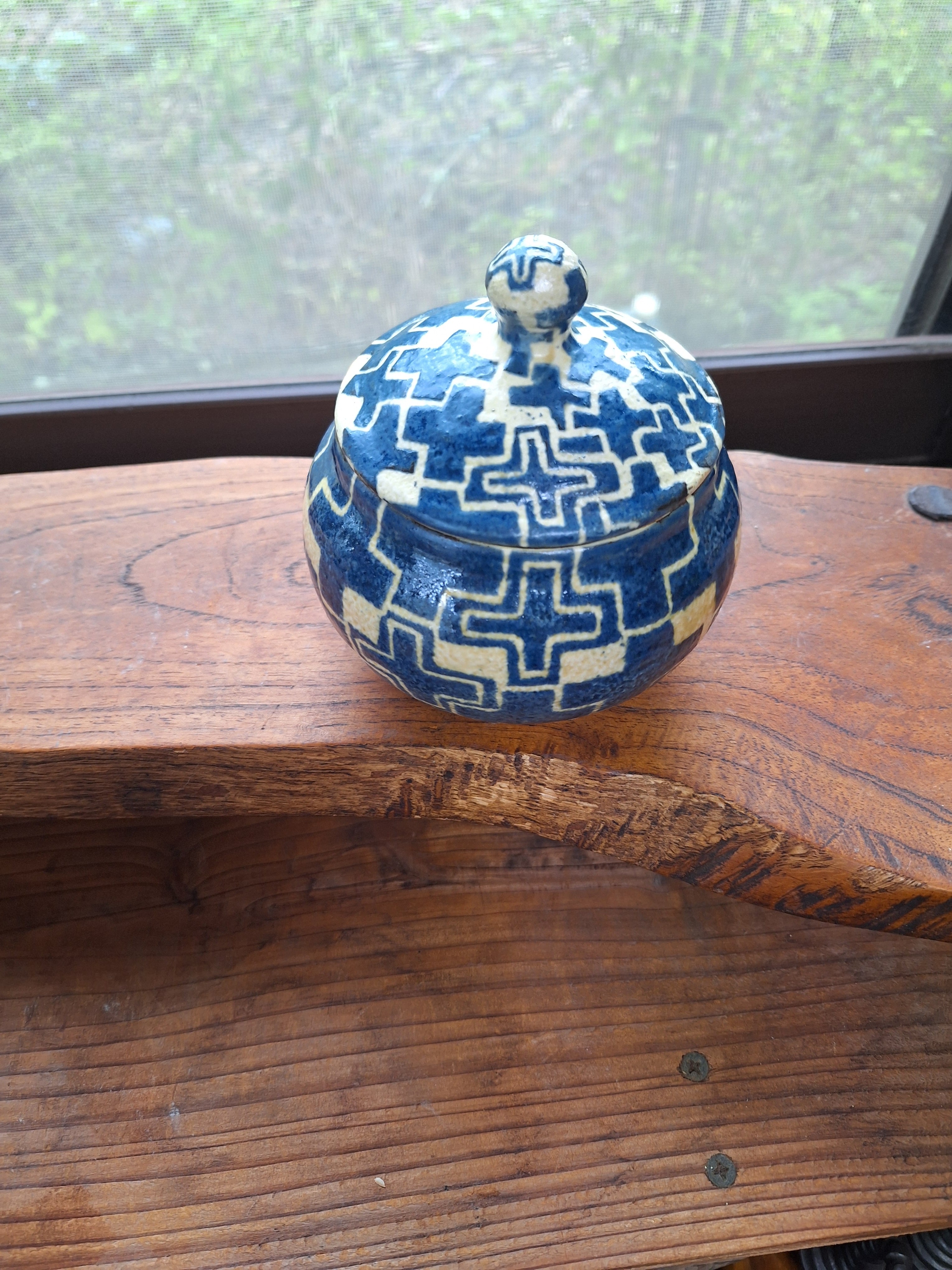 ツマミありの蓋物 プラス模様です 胴の太さが直径約11.5センチ高さが約11.5センチです うつわの内側はサトウキビ灰で拵えました白釉を施してあります