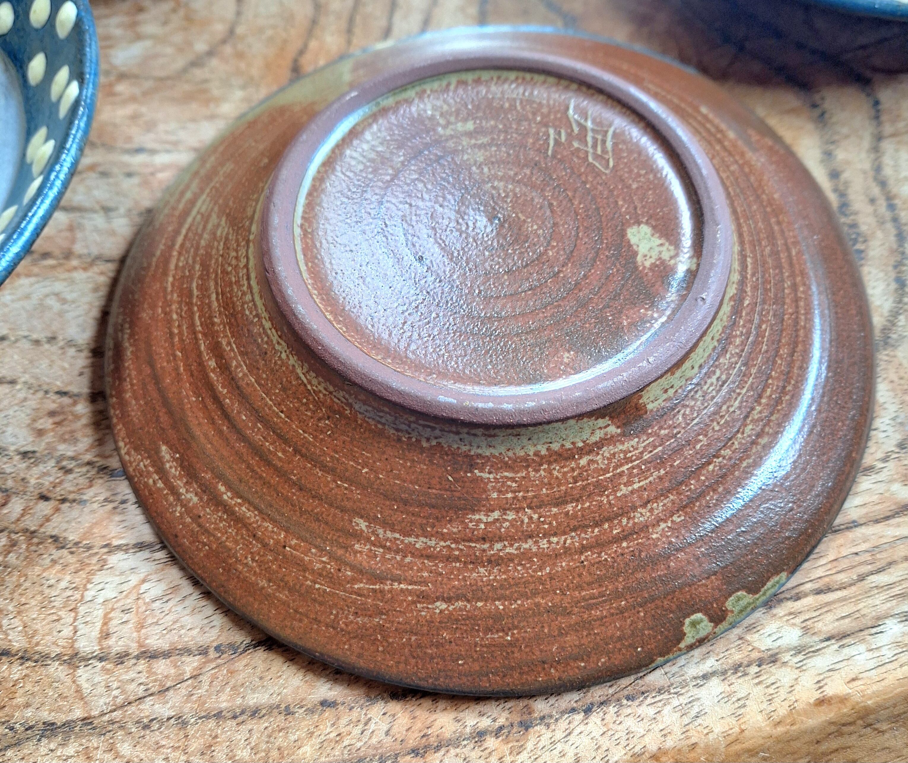 ドット、ストライプの模様は白土を絞り出しながら描く「いっちん」の技法で描きました うつわの真ん中はサトウキビ灰でこしらえましあ白釉を施してあります