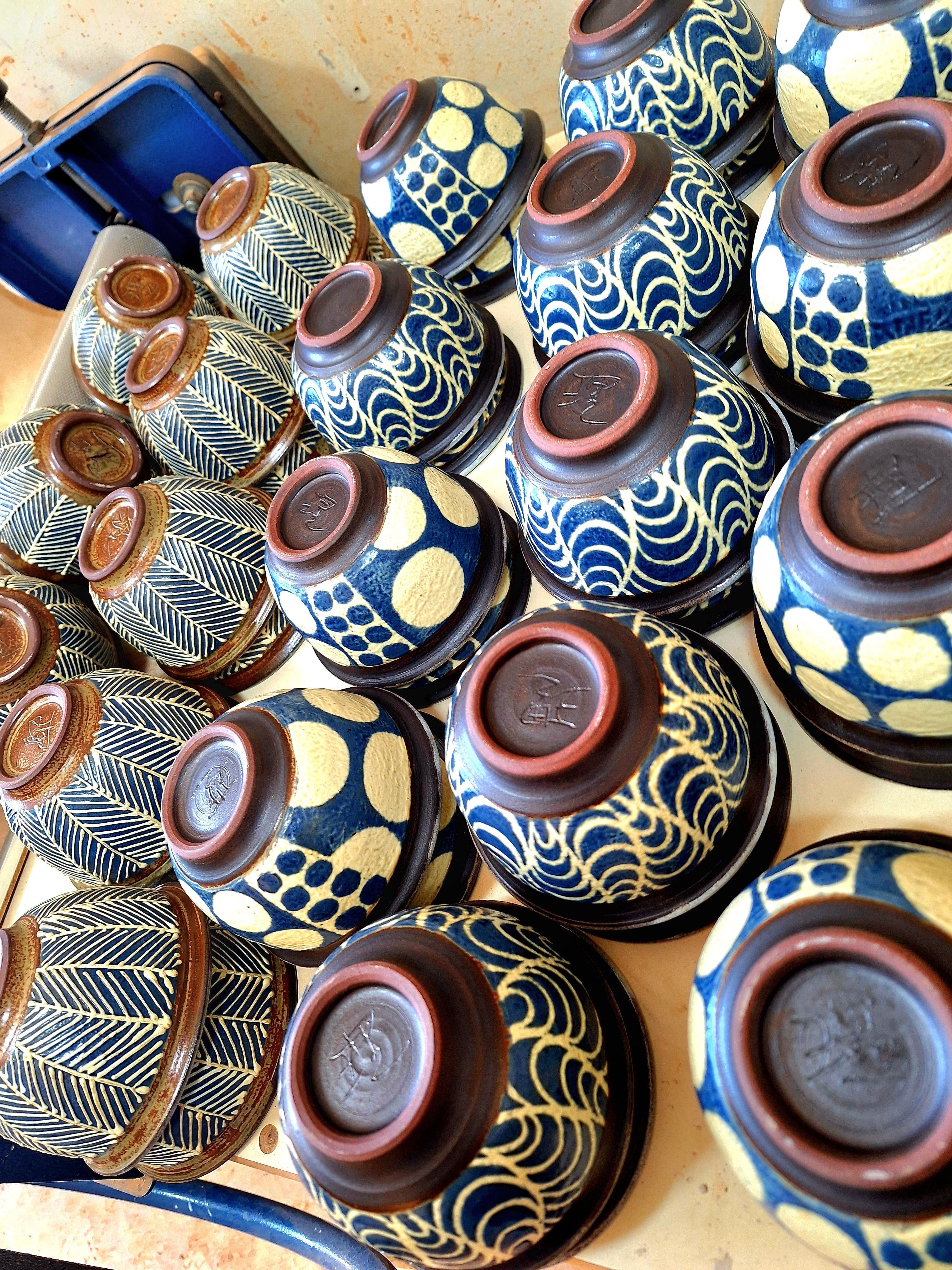 外側は青と白の化粧土でドットを描き 口辺と高台部分はマンガンで艶消しの黒で押さえたモダンな印象です うつわの内側はサトウキビ灰でこしらえました白釉を施してあります